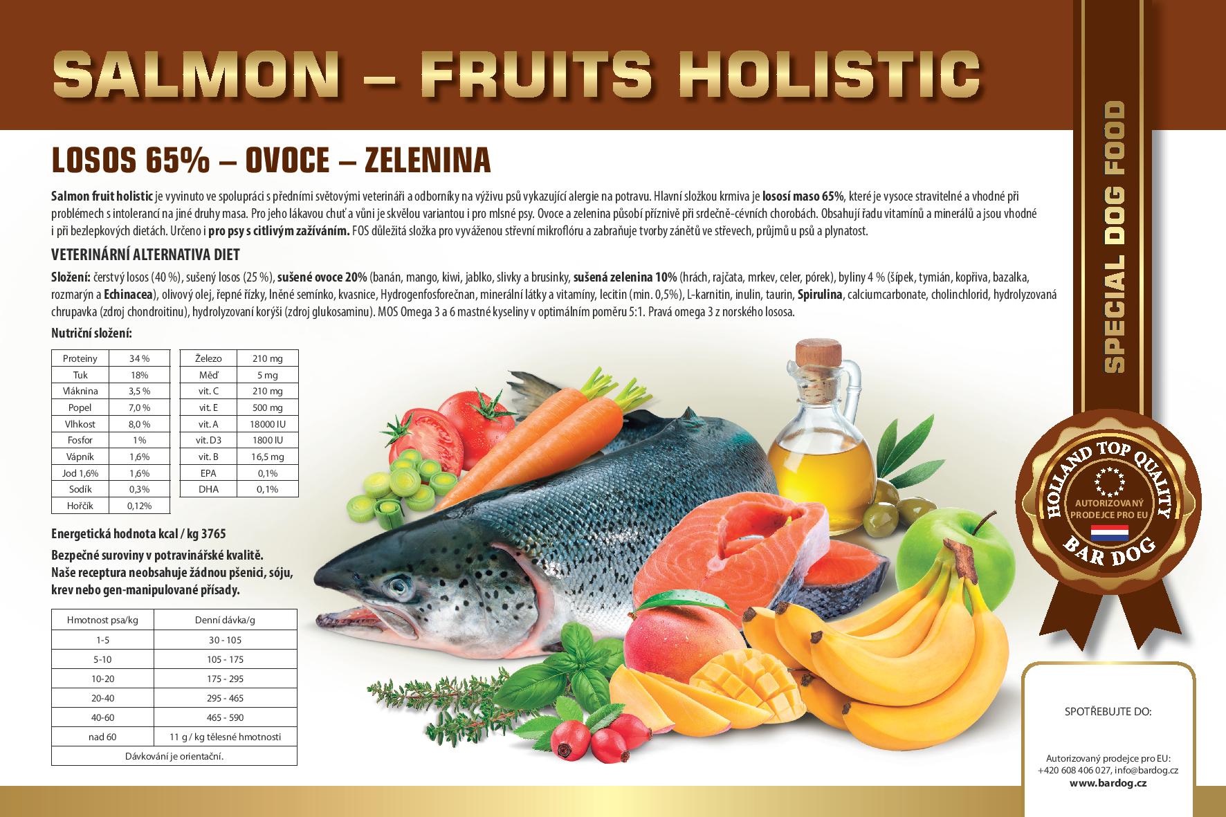 Složení: čerstvý losos (40 %), sušený losos (25 %), sušené ovoce 20% (banán, mango, kiwi, jablko, slivky a brusinky, sušená zelenina 10% (hrách, rajčata, mrkev, celer, pórek), byliny 4 % (šípek, tymián, kopřiva, bazalka, rozmarýn a Echinacea), olivový olej, řepné řízky, lněnése mínko, kvasnice, Hydrogenfosforečnan, minerální látky a vitamíny, lecitin (min. 0,5%), L-karnitin, inulin, taurin, Spirulina, calciumcarbonate, cholinchlorid, hydrolyzovaná chrupavka (zdroj chondroitinu), hydrolyzovaní korýši (zdroj glukosaminu). MOS Omega 3 a 6 mastné kyseliny v optimálním poměru